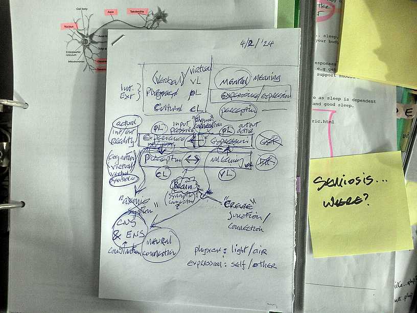 As a placeholder for this diagram, I posted a photograph of an initial hand-drawn sketch and noticed the Post-It note in it. Although referring to another task, it seemed prescient, pointing out my diagram is simply an echo of the schema of biosemiosis published over one hundred years earlier by Jakob von Uexkull, and that I should acknowledge this — particularly as subsequently his work was so violently embraced by the Nazis and their 'scientists'.